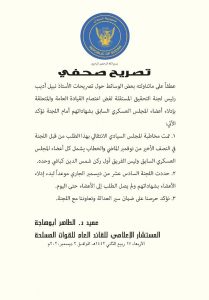 أكد فيه مخاطبة المجلس السيادي الائنقالي بهذا الطلب من قبل اللجنة في النصف الأخير من نوفمبر الماضي، والخطاب يشمل كل أعضاء المجلس