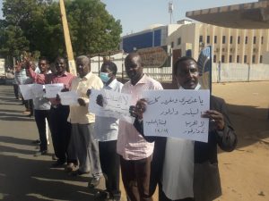 نفذت لجنة المعلمين السودانية ظهر اليوم وقفة احتجاجية امام وزارة التربية والتعليم ورفع المحتجين الذين اصطفوا بشارع النيل شعارات منددة بما وصفوه بالانقلاب ومطالبة بالتحول الديمقراطي واوضح الاستاذ علي عبيد مدير المكتب التنفيذي للجنة في تصريحات صحفية ان الوقفة تأتي استجابة لدعوات قدمها اكثر من 25 جسما مهنيا بكافة الوزارات والمؤسسات الحكومية وقال ان هذا اليوم يوم آخر من ايام ثورة ديسمبر نؤكد فيه ان جذوة الثورة لازالت متقدة وسط المهنيين مبينا ان اللجنة تؤكد انها جنبا الى جنب مع الشعب السوداني والثوار في ماوصفه بالردة التي حدثت نتيجة لقرارات 25 اكتوبر والتي تريد ان تعيد مرة اخرى مكونات النظام السابق الى الساحة السياسية .