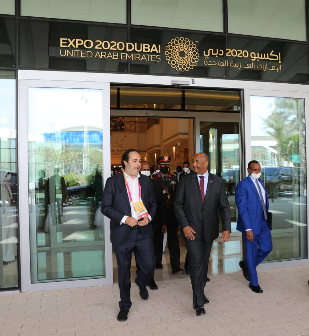 ورافق رئيس مجلس السيادة الانتقالي خلال زيارته معرض إكسبو ٢٠٢٠ دبي وزير المالية والتخطيط الاقتصادى د. جبريل ابراهيم، وزير الخارجية المكلف على الصادق، مدير جهاز المخابرات العامة الفريق احمد ابراهيم علي مفضل،المدير العام لمنظومة الصناعات الدفاعية الفريق أول ركن ميرغني ادريس، رئيس إتحاد أصحاب العمل السوداني، هشام حسن السوباط وسفير دولة الإمارات العربية المتحدة لدى السودان، السفير، حمد محمد الجنيبي.