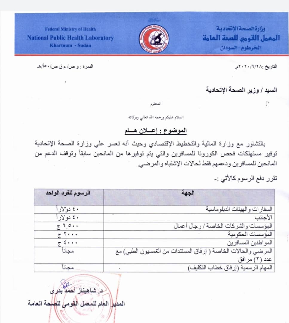 وعليه قررت وزارة الصحة الإتحادية ممثلة في المعمل القومي للصحة العامة بعد التعثر على توفير مستهلكات فحص الكورونا وبعد التشاور مع وزارة المالية والتخطيط الإقتصادي دفع رسوم كالآتي:-