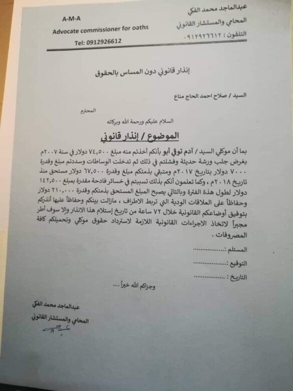 وبعث المحامي عبد الماجد محمد الفكي بإنذار قانوني لمناع، يدعي فيه أخذ الأخير مبلغ 74.5 ألف دولار، لاستجلاب ورشة حديثة في 2007 وبعد تدخل وساطات أعاد مناع 7 ألف دولار في 2017.مشيراً إلى أن مناع لم يوف ببيقة المبلغ، ولا حجم الأضرار المقدرة بـ142.5 ألف دولار.