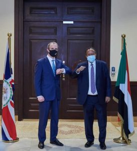 والتقى حمدوك، برئاسة مجلس الوزراء وزير الخارجية البريطاني دومينيك راب والوفد المرافق له الذي يزور البلاد في زيارة تاريخية تعد الأولى من نوعها منذ أكثر من عقد، وذلك بحضور وزير شؤون مجلس الوزراء السفير عمر بشير مانيس ووزير الخارجية المكلف د. عمر قمرالدين ووزيرة المالية والتخطيط الاقتصادي المكلفة د. هبة محمد علي.
