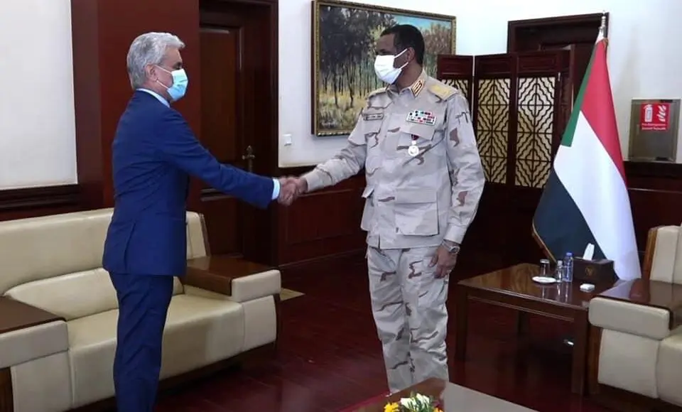 التقى نائب رئيس مجلس السيادة الفريق اول محمد حمدان دقلو بمكتبه بالقصر الجمهوري اليوم، مبعوث الاتحاد الأفريقي السفير محمد ولد لبات بحضور بالممثل الخاص الاتحاد الأفريقي لدى السودان السفير محمد بلعيش.