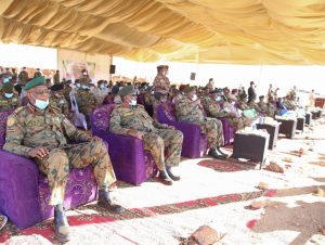 وقال خلال مخاطبته ختام فعاليات مشروع التدريب العام (أحفاد تهراقا ٤) بمنطقة شاكوت العسكرية شمال شرق مدينة بحري لوحدات اللواء الخامس ومشاة والقوات الجوية والدفاع الجوي وقوات الدعم السريع بحضورالفريق الركن عبد الله البشير أحمد الصادق نائب رئيس هيئة الأركان تدريب والفريق الركن عصام محمد حسن كرار قائد القوات البرية وقيادات الوحدات العسكرية قال “نختتم اليوم النسخة الرابعة من التدريب العام للقوات المسلحة والبلاد تمر بكثير من العقبات والتحديات مما اثر كثيراً على عمليات التدريب” مبينا بان مشروع التدريب ضرورة للمؤسسات العسكرية وان القوات المسلحة تختتم تدريبها وتستشرف عملية السلام فى البلاد وكانت القوات المسلحة وقودا للحرب طيلة الخمسة عقود الماضية والان تعمل على حماية السلام .
