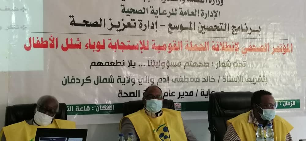 جاء ذلك لدى مخاطبته بقاعة التدريب المهني المستمر بالابيض المؤتمر الصحفي لانطلاق الحملة القومية للاستجابة لوباء شلل الأطفال وتدشين الحملة بالولاية ، مشيراً لخطورة وباء شلل الأطفال والتصدى له لحماية وتحقيق الأمن الصحي للأطفال، داعياً أولياء الأمور الحرص على تحصين أطفالهم.